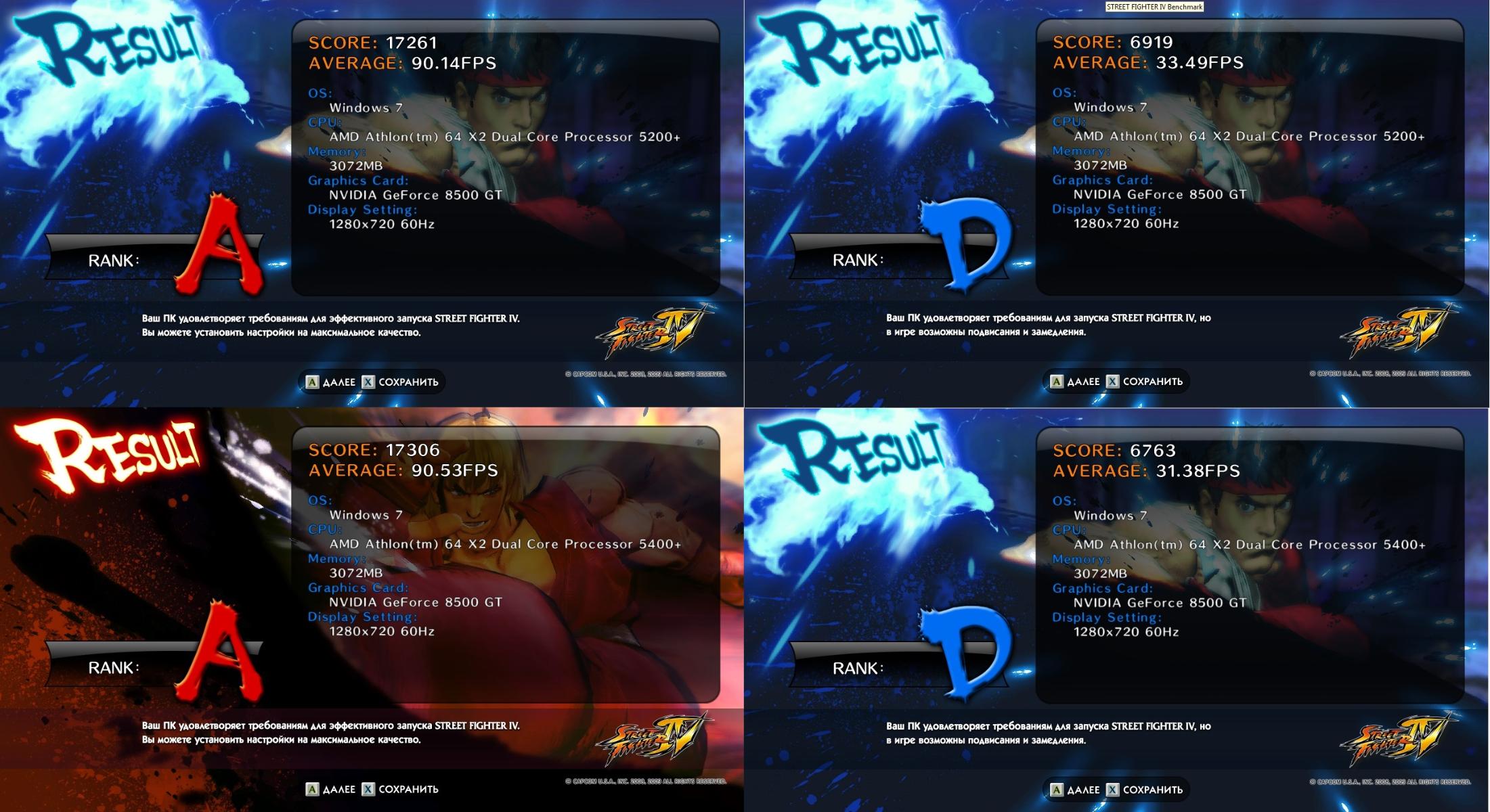 В Street Fighter IV у нас интересная ситуация: на минимальных настройках вперёд выходит 5400+ с большей тактовой частотой, а вот на максималках быстрее, причём ощутимо, выступает 5200+ с большим кэшем.
