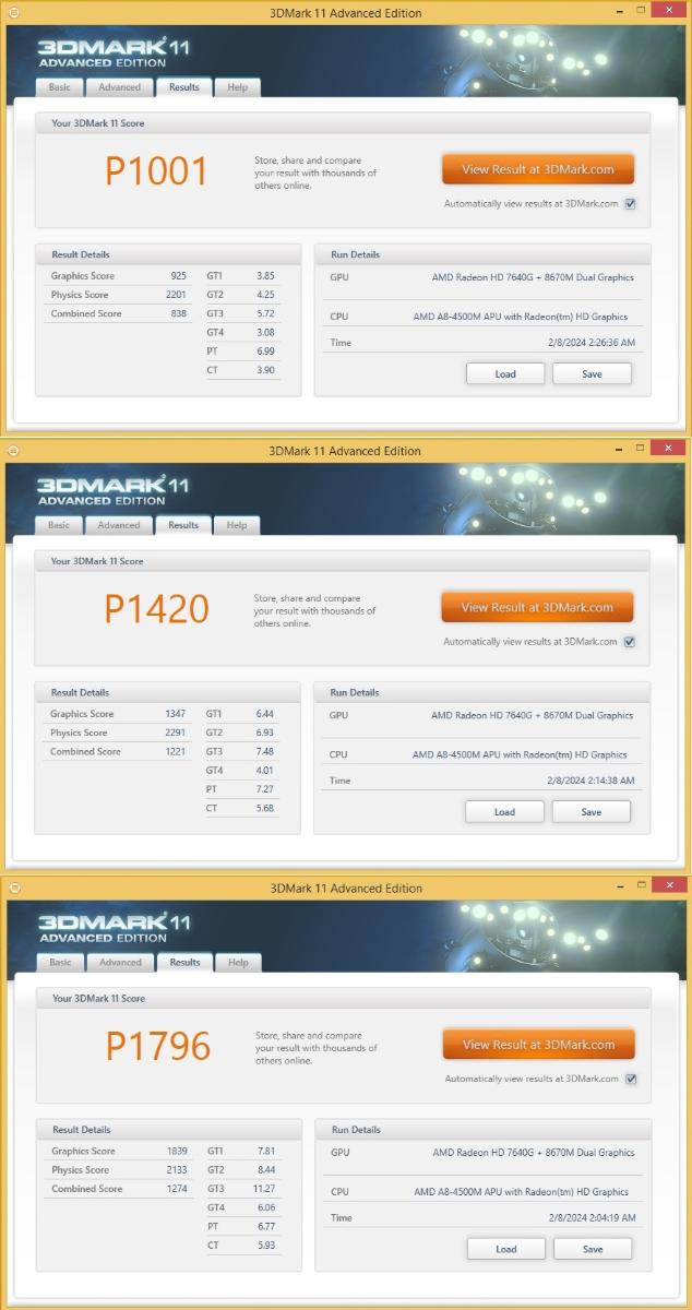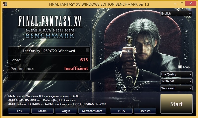 Собственно, как видите на скриншоте, тест прошёл только один вариант, а именно интегрированная графика. Дискретка и Dual Graphics тест не осилили по причине падения драйвера, судя по тому, что я понял из логов, произошло это из-за нехватки видеопамяти, которой у дискретки я напомню 512Mb. Т.е. в очередной раз фирма AMD не смогла в нормальные драйверы.
