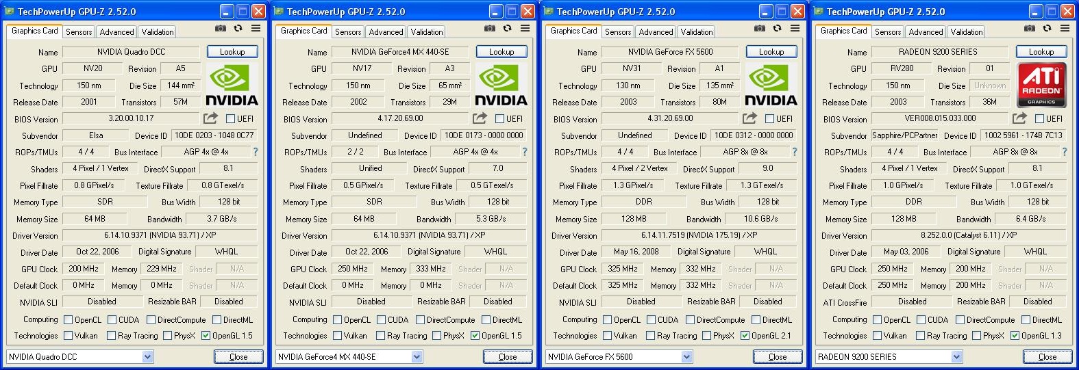 Но вернёмся уже к нашему испытуемому, собственно отличий от оригинального GeForce 3 тут особо и нет, за исключением драйверов с поддержкой всяческих там CAD приложений, в частности из того что я смог узнать - такая поддержка есть в 3D Studio Max 4. Однако нам все эти навороты не очень интересны, нам интересно чего оно умеет в играх. Ну а коли у нас тесты, то предлагаю подобрать ему достойных конкурентов из того что у меня есть в наличии. Ими буду nVidia Geforce 4 MX440 64Mb SDR 128bit, который пришёл с ним вместе, ATi Radeon 9200 128Mb 128bit как наиболее прямой конкурент, а также nVidia GeForce FX5600 128Mb 128Bit который я купил когда-то давно с первой зарплаты в 2005 году на замену GeForce 4 MX440. Собственно, вот все они в GPU-Z - для наглядного сравнения.