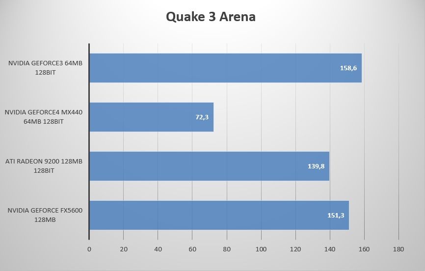 GeForce 4 MX440 осилил только один тест из четырёх, GeForce 5600 вырвался вперёд за счёт прохождения всех четырёх тестов, а вот в паре Radeon 9200 и GeForce 3, прошедшей три теста из четырёх возможных, первенство остаётся за видеокартой от nVidia.