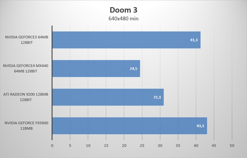На минимальных настройках GeForce 3 уверенно занимает второе место, а вот на максимальных настройках графики проваливается на третье, что в принципе объясняется малым объёмом видеопамяти на борту, ибо в данном режиме Doom 3 рекомендует использовать видеокарты с не менее чем 256Mb видеопамяти.