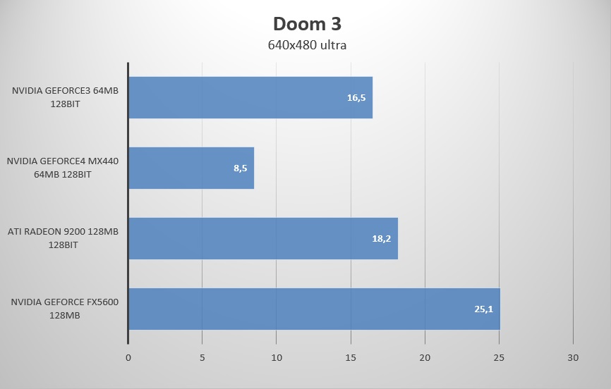 Ну а тут я даже не знаю, как комментировать, это какой-то... позор... GeForce 3 просто уничтожает конкурентов, однако это уже на минимальных настройках качества графики и малый объём памяти не даёт их особо повышать. Впрочем, такие показатели могут обуславливаться тем, что GeForce 3 использует шейдеры версии 1.1, а у Radeon 9200 и GeForce FX5600 работают шейдеры 1.4. И увы игра не даёт возможности выбрать, какую именно версию шейдеров использовать.