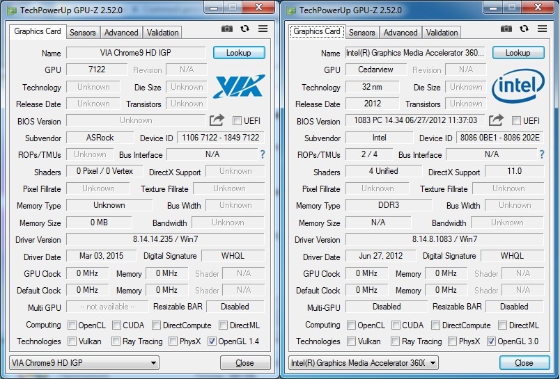 GPU-Z нам ясной картины не даёт по данным графическим чипам, но стоит отметить что VIA Chrome9 поддерживает DirectX 9.0, а вот Intel HD3600 уже умеет в DirectX 9.0c. По частотам чипа опять же превосходство за Intel 400MHz против 250MHz.