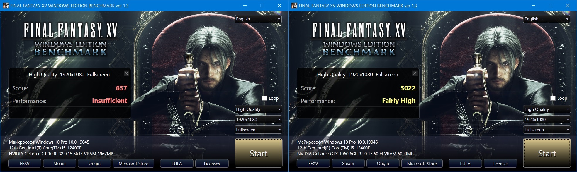 Итак, тестовый стенд у нас это Intel Core i5 12400F, 32Gb оперативной памяти DDR5 5600, ну и видеокарты у нас MSI GeForce GT 1030 AERO ITX 2GD4 OC и Palit GeForce GTX 1060 JETSTREAM.