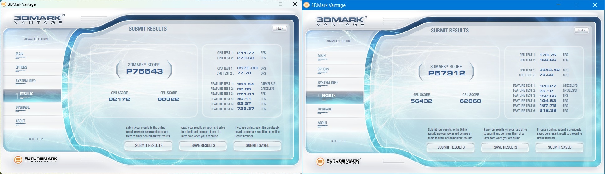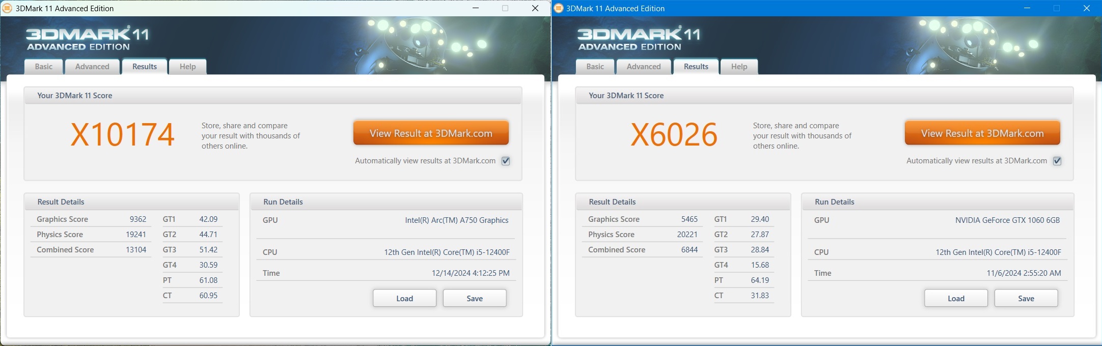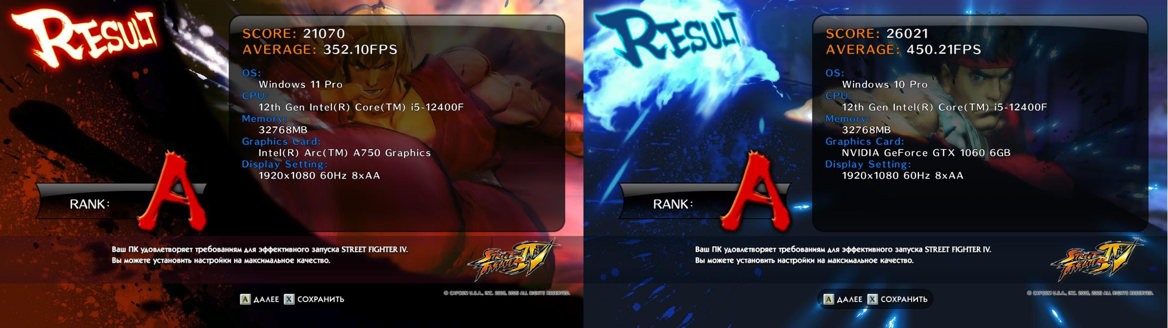 Данный тест под DirectX 11 использует разрешения 720p в стандартном режиме, где превосходство Intel Arc A750 8Gb над nVidia GeForce GTX 1060 6Gb составляет 90%, а в экстремальном режиме в разрешении 1080p превосходство падает до 70%, что, впрочем, тоже неплохо. И вновь просадка производительности процессора, теперь уже на 5% при использовании видеокарты Intel Arc A750 8Gb.