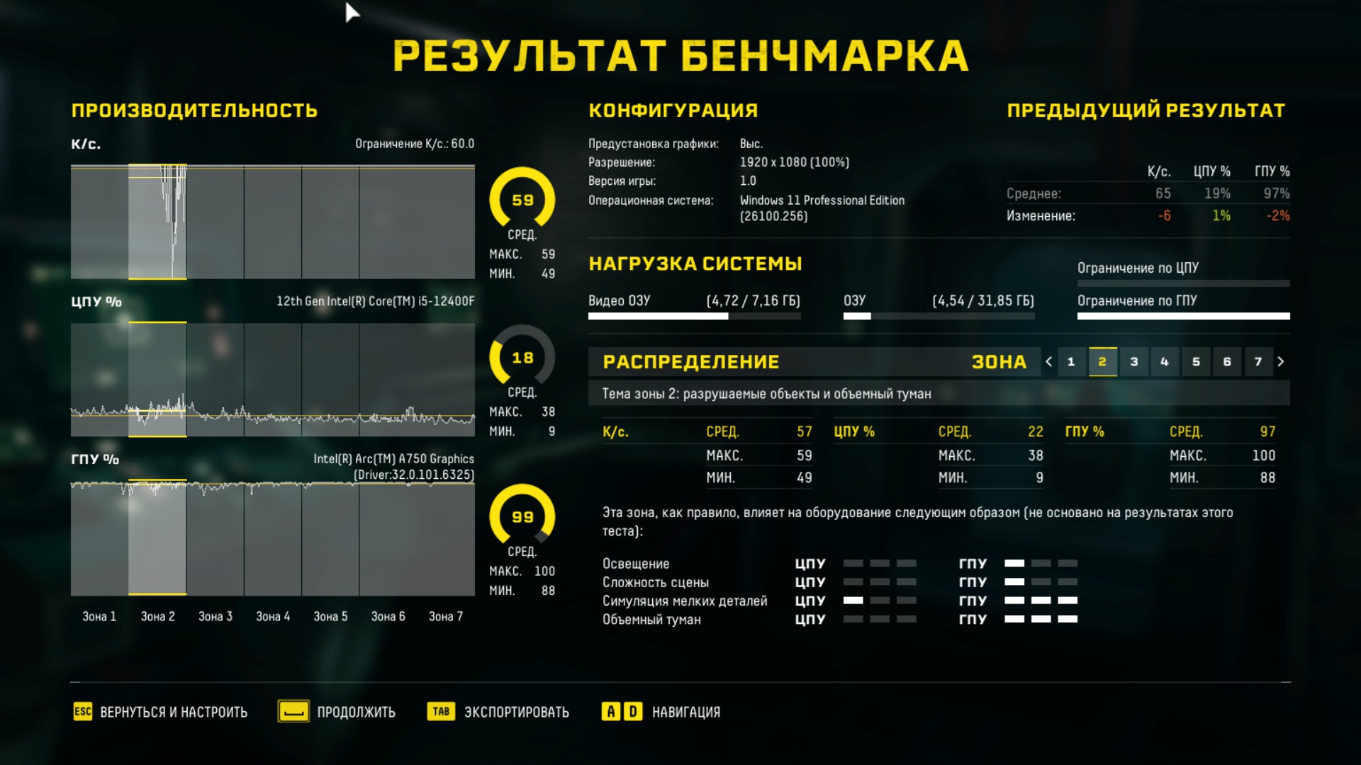 Данная игра использует DirectX 11.2, так что превосходство нашей Intel Arc A750 8Gb вновь скромное и составляет всего 5% на низких, 25% на средних, 40% на максимальных настройках графики. И, как и в тестах 3DMark мы видим повышенную нагрузку на процессор при использовании видеокарты Intel Arc A750 8Gb.