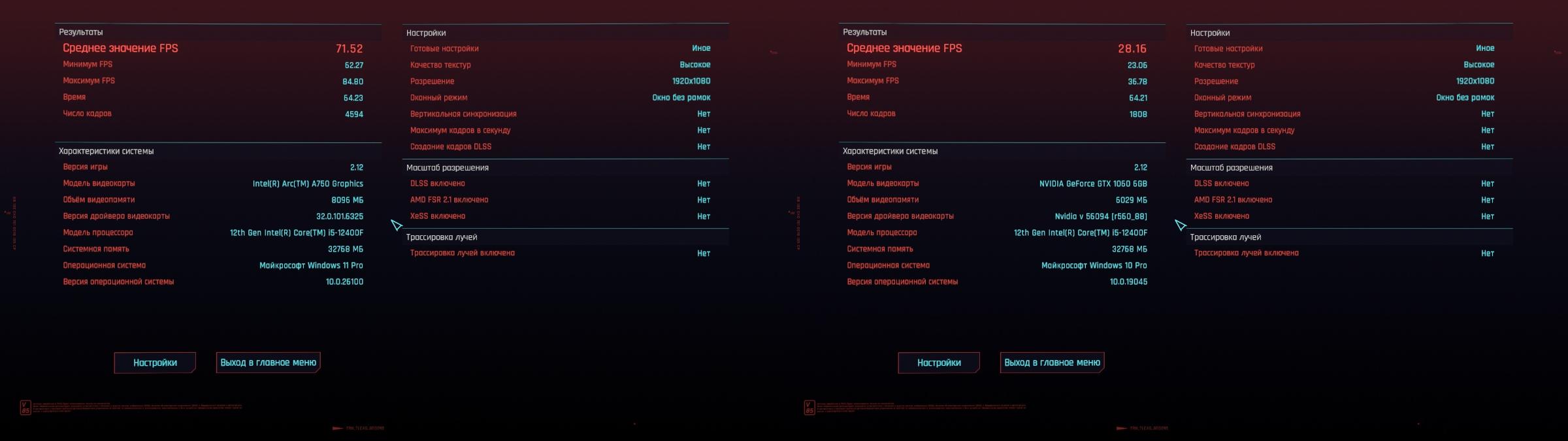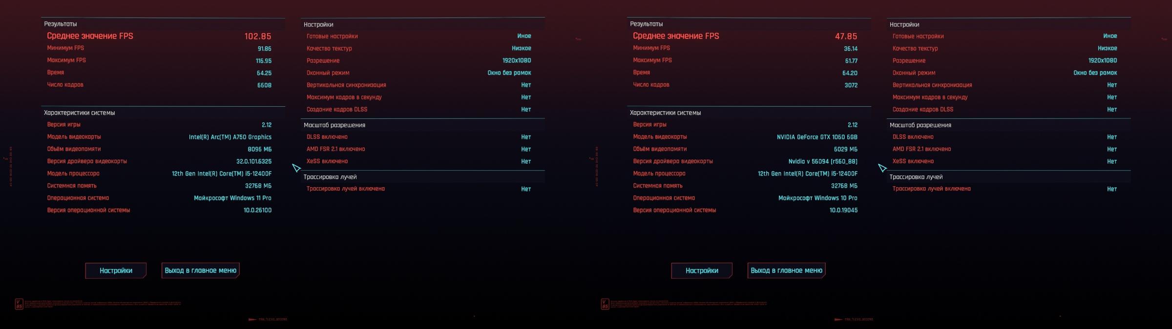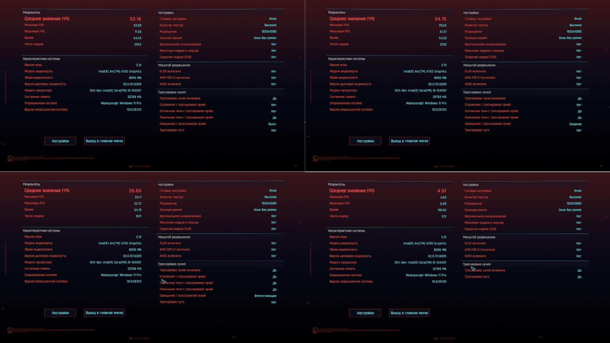 Cyberpunk 2077 также использует DirectX 12, что даёт нам прирост в 110% на низких настройках и 150% на максимальных настройках без Ray tracing. А вот сам Ray tracing увы тут только для "посмотреть", ибо в лучшем случае разумным будет использовать локальные тени, или ограничиться 30 fps без отражений, ну а включив таковые придётся уже задействовать Intel XeSS для комфортной игры.