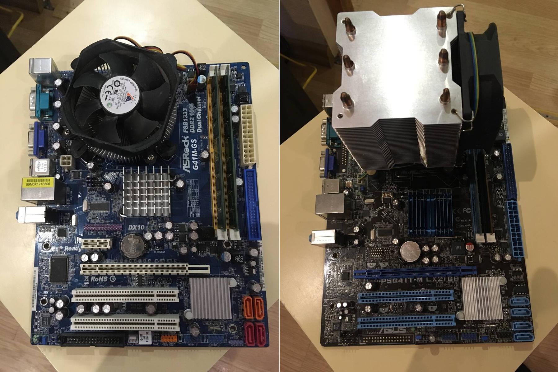 Платы, как вы можете видеть довольно простенькие и мало чем друг от друга отличаются. Радиатора, кстати, на южном мосте у Asus не было, это уже я поставил из своих запасов. Собственно, на данный момент это один из самых распространённых видом материнских плат для 775 платформы и даже порой, они ещё встречаются новыми на полках магазинов. Что не удивительно, ибо для следующего после 775 сокета 1156 компания Intel выпустила всего 1 поколение процессоров, а офисных Celeron для него не выпустила вовсе, так что G41 и Celeron под 775 сокет во всю производились и продавались вплоть до выхода нового сокета 1155 и появления бюджетных процессоров Celeron для оного.