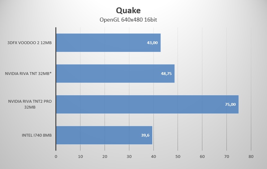 Своего ровесника i740, наша Voodoo2 обходит практически в два раза, а вот до уровня TNT2 конечно ей уже далеко. Как видим "теоретическая" Riva TNT, вышедшая в третьем 1998 года, выступала на уровне Voodoo2, которая вышла во втором квартале 1998 года, но эт не точно. На релизе правда там были проблемы с драйверами, но зато ценник у неё был в 2 раза ниже, так что и цены на Voodoo2 к концу года упали до тех же 149$, что несколько подгадило поляну Voodoo Banshee вышедшей одновременно с RivaTNT, и за которую на старте просили столько же "грязных зелёных бумажек".