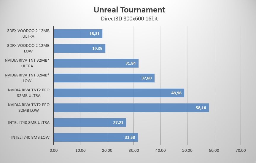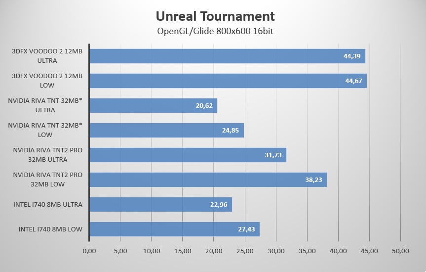 Несмотря на данный график, Voodoo2 выступает довольно неплохо для своего почтенного на тот момент возраста почти в 2 года, а катастрофическое падение частоты кадров в режиме Ultra объясняется нехваткой видеопамяти, напомню памяти под текстуры у неё всего 8Mb. Решением тут является понижение качества текстур с Ultra до High, что сразу повышает кадровую частоту выше 35к/сек, чего правда всё равно недостаточно для того чтоб тягаться с Riva TNT2.