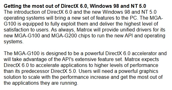 Зачем? Ответ я думаю мы уже никогда не узнаем. Логичным решением было вообще отключить все 3D возможности данной карты и сделать из неё чистую 2D карту, и цены бы ей не было в паре с какой-нибудь Voodoo2, ибо качество 2D картинки у карты просто отменное, но ума у Matrox на это не хватило. И таким макаром Matrox встала в один ряд с компанией S3, которая выпустила примерно такого же уровня парашу под названием S3 Trio3D, но как бы от S3 никто чудес не ждал, да и громких заявлений о полной поддержке DirectX 6.0 данной картой она при этом не делала.