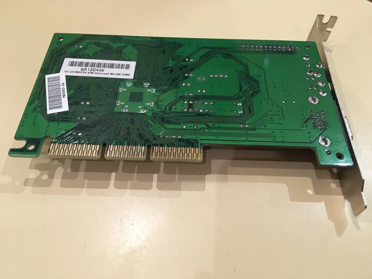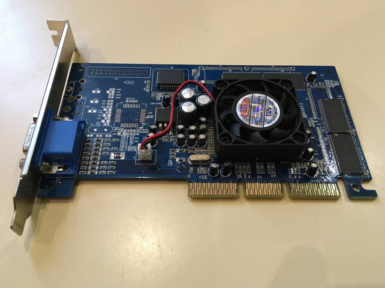 Первая видеокарта это у нас, можно сказать, "полноценный" GeForce2 MX400 с 128bit шиной памяти, правда памяти этой всего 32Mb, чего, впрочем, было в те времена достаточно для видеокарт такого класса. На карте даже распаян TV-out, что тогда было вполне актуально. Увы охлаждение тут достаточно паршивое, ещё и радиатор приклеен намертво к чипу. Впрочем, проблем со стабильностью у карты нет, но чисто эстетически это неприятно...