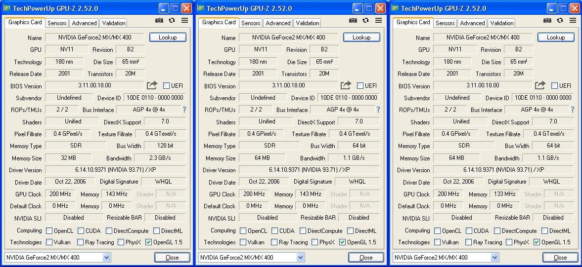А он нам показывает, что все три карты не соответствуют официальным спецификациям nVidia и имеют заниженные частоты памяти, вместо положенных 166/200MHz - у нас тут 143MHz, а на карте с пассивным охлаждением так вообще 133MHz. Т.е. на лицо китайско-подвальное происхождение данных карт, кои в те времена занимали добрых 50% рынка в России. Самое интересное что память, распаянная на данных платах может работать и быстрее, если верить её маркировке 5ns на платах с 143MHz памятью и 7ns на плате с 133MHz память. Почему же китайцы по итогу занизили частоты - непонятно, возможно память была не от надёжного поставщика, или же дизайн самих плат оказался кривым, и они работали нестабильно - вопрос интересный, но в данной статье он исследоваться не будет. Ну и естественно никакой маркировки на самих картах, о том какая шина памяти - нет, только модель и количество памяти.