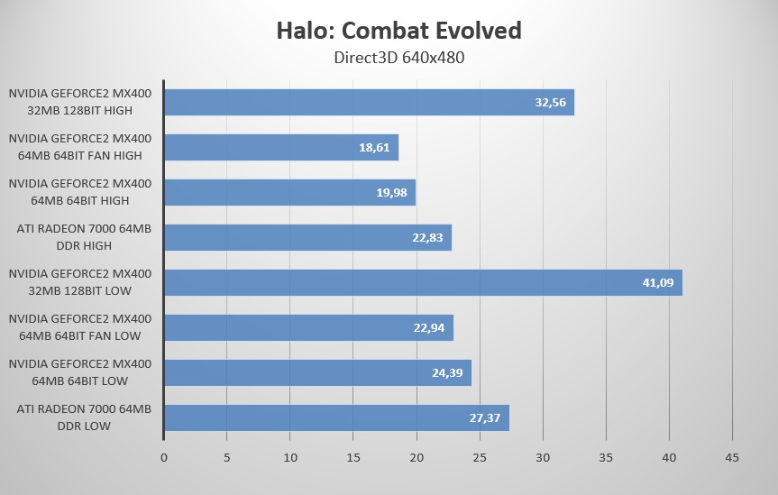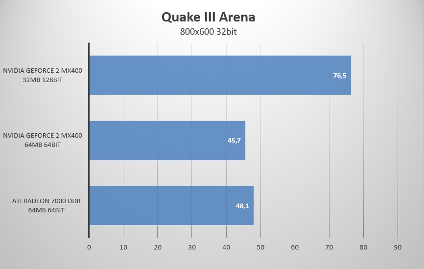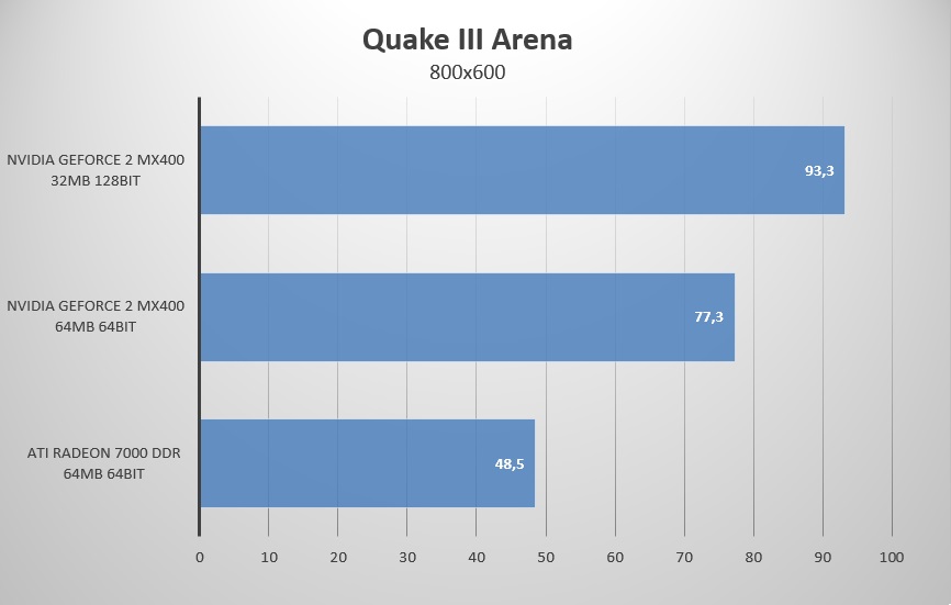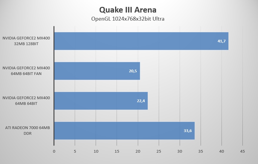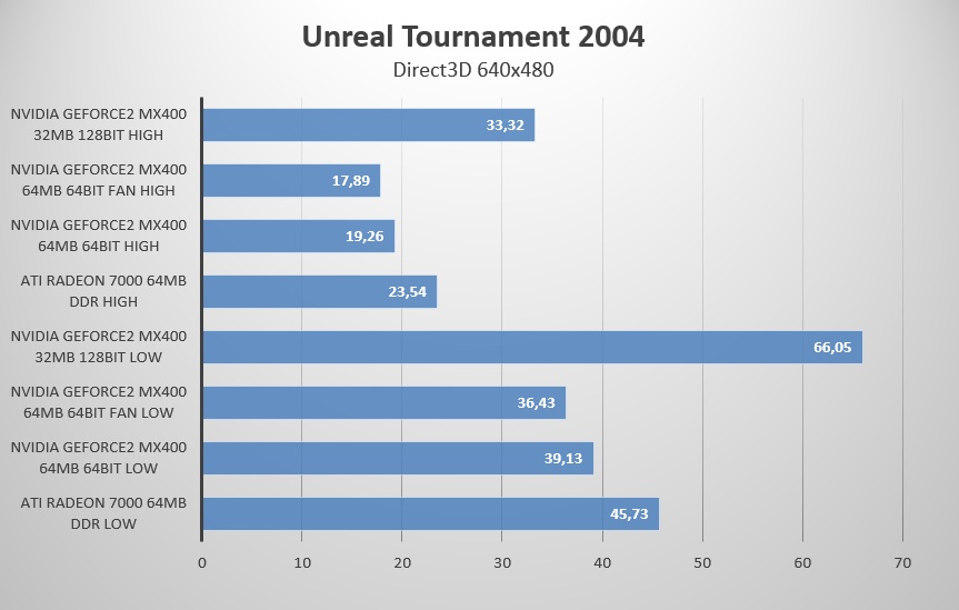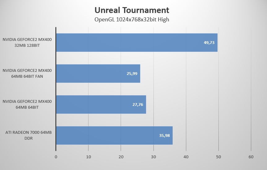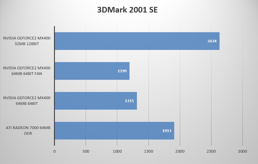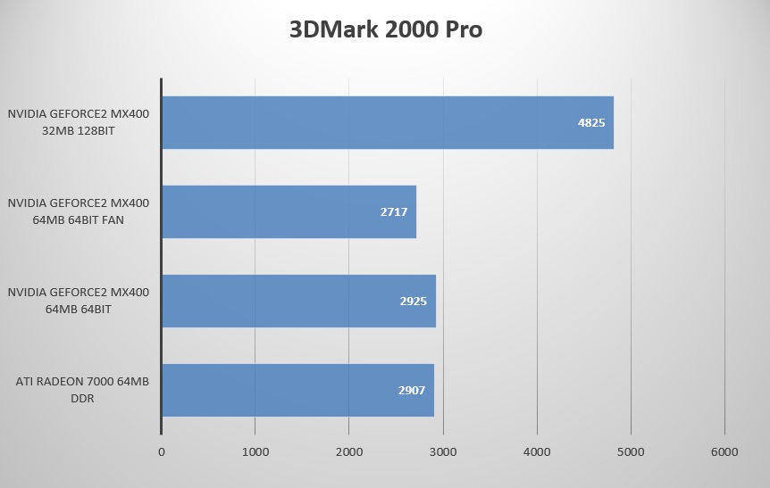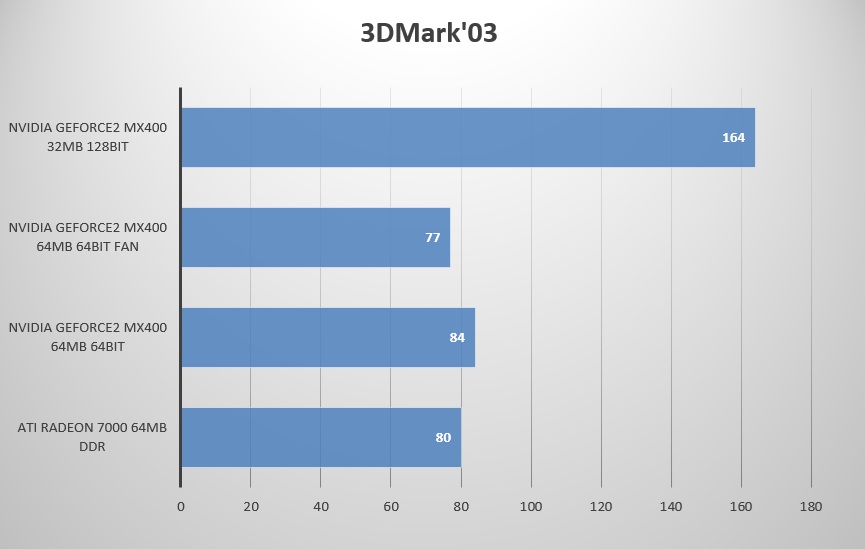 Ох-хо-хо... мало того, что 64bit версия GeForce2 MX400 уступает в двое 128bit версии, так ещё и Radeon 7000 обходит их по производительности на 30%.