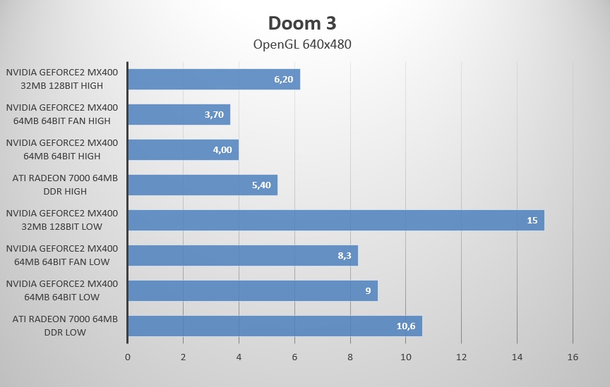 Ну и Doom 3 нам лишь в очередной раз подтверждает выше-озвученные тезисы о полнейшей несостоятельности видеокарт GaForce2 MX400 оснащённых 64bit шиной памяти. А вот 128bit версия вполне имела место быть, вот только для её покупки надо было либо обладать соответствующими знаниями, либо удачей, дабы не нарваться при покупке на барыг, коих племя и по ныне живёт и здравствует - наживаясь на безграмотности подавляющего числа населения...