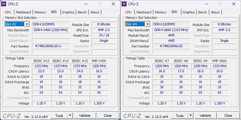 Слева - оригинальная AMD память, а справа - подвальная подделка. По итогу материнская плата определяет их обе-две как 2400, что меня более чем устроило, и делать я с этим ничего не стал.