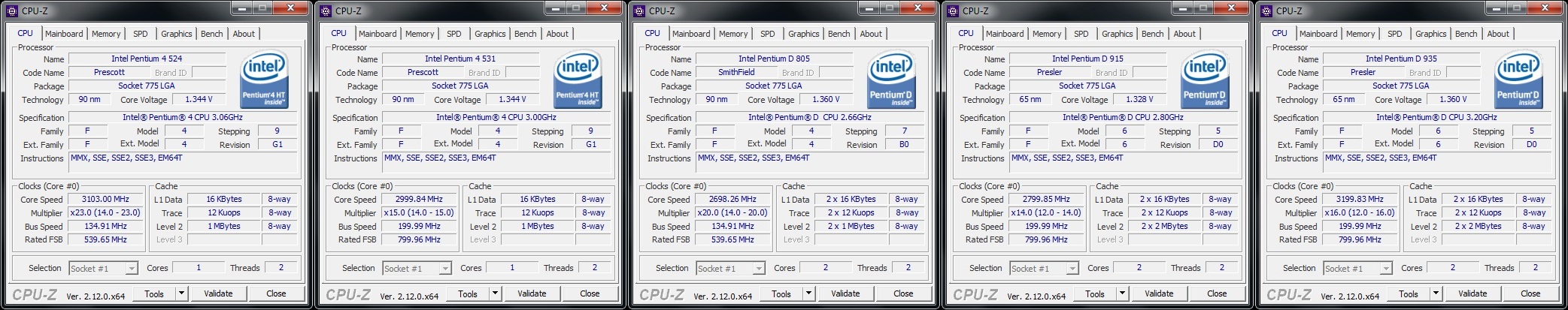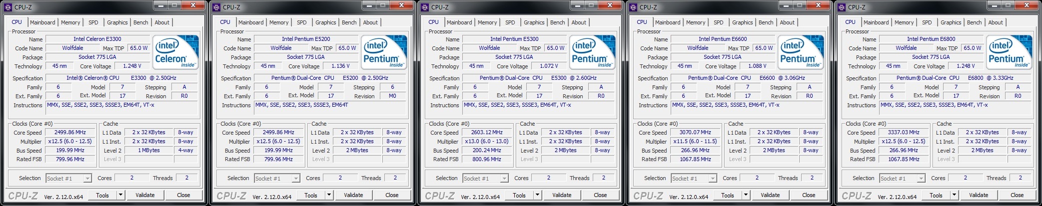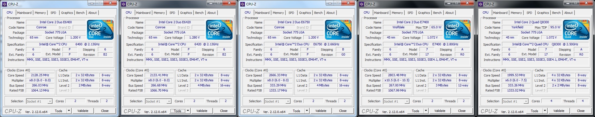 Как видите это практически всё возможное разнообразие доступных под Socket 775 процессоров, разве что не хватает ранних 32bit Pentium 4, и одноядерных Celeron, но в целом - невелика потеря.