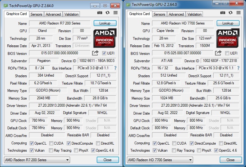 Как обычно он нам брешет за тип памяти, упорно называя её GDDR3, но по фото видеокарты явно видно, что это простая DDR3 память. Ну да ладно, как видим у нашего сегодняшнего пациента меньше исполнительных блоков, зато в 2 раза больше видеопамяти. В остальном же это практически идентичные чипы, ну точнее, чип у R7 240 это удешевлённая версия, с до кучи порезанной вдвое шиной PCI-E - c 16 до 8 линий.