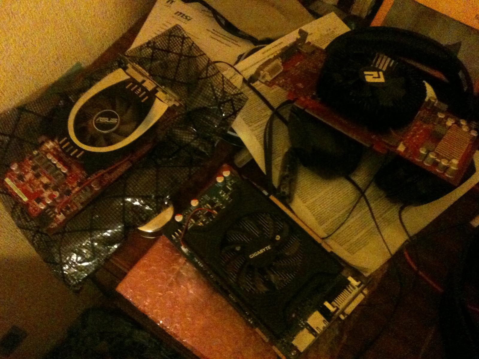 Видеокарты были демонтированы и проданы на Авито... благо как раз у меня был переезд и пришло время избавляться от накопившегося хлама... впрочем прошло уже лет 5, а хлам до сих пор распродаётся.