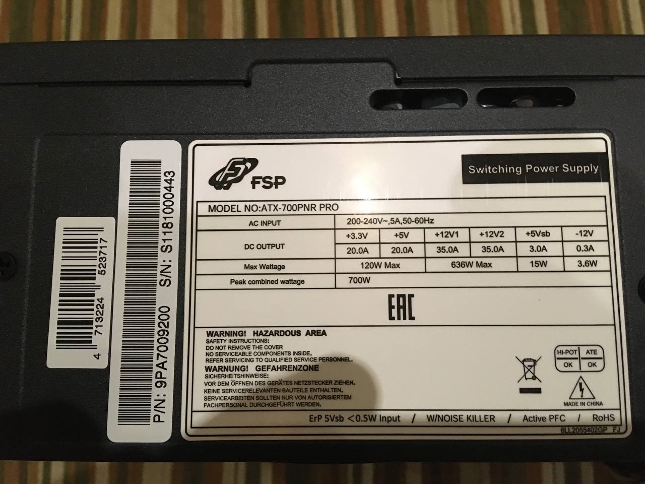 Собственно, что у нас дальше - блок питания, на вскидку видеокарта + процессор потребляют +/-300вт, так что ориентироваться надо на 500-600 ватный блок питания, чтобы +/- на всё хватило с запасом. И был выбран FSP ATX-700PNR PRO за 5000р.