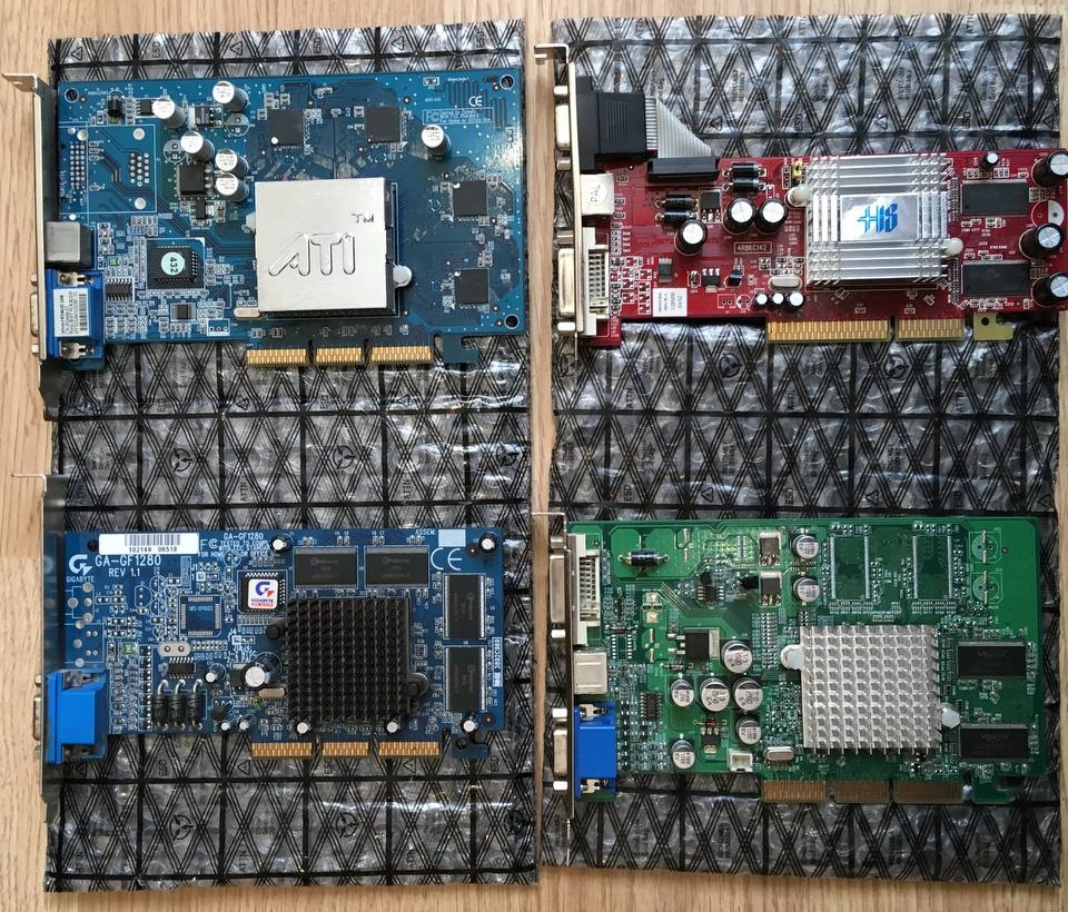 GeForce 4 MX440 имеет оторванные компоненты на плате и при попытке запуска 3D приложений у него пропадает изображение, Radeon 9550 SE выдаёт синий экран при попытке установить драйверы, GeForce 2 MX400 имеет сгнившую плату в местах пайки конденсатора, и я даже не стал пытаться его запустить, а GeForce FX 5200 выдаёт артефакты на экране сразу при включении ПК.