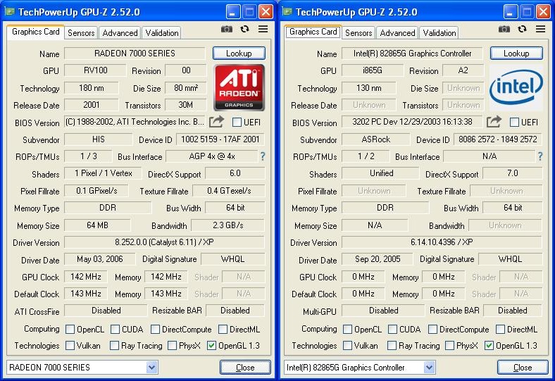 Обе видеокарты не имеют блоков Hardware T&L, а Radeon 7000 оказывается умеет в шейдеры, но правда только в один пиксельный и один вершинный, что явно какой-то атавизм и в реальности нигде не используется. Так же Radeon имеет урезанные частоты по чипу/памяти 143/143MHz, хотя в заводских спецификациях для чипа RV100 указаны варианты 150/150, 166/166 и 183/183. Обе этих видеокарты имеют неплохую программную оптимизацию и, хотя родом они из конца 90х, однако позволяют многое на них запускать, пусть и в неиграбельном состоянии.