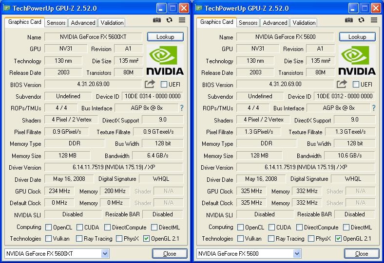 Тут сказать особо нечего - типичные FX 5600, хотя у старшего разогнана память с 275 до 333MHz.