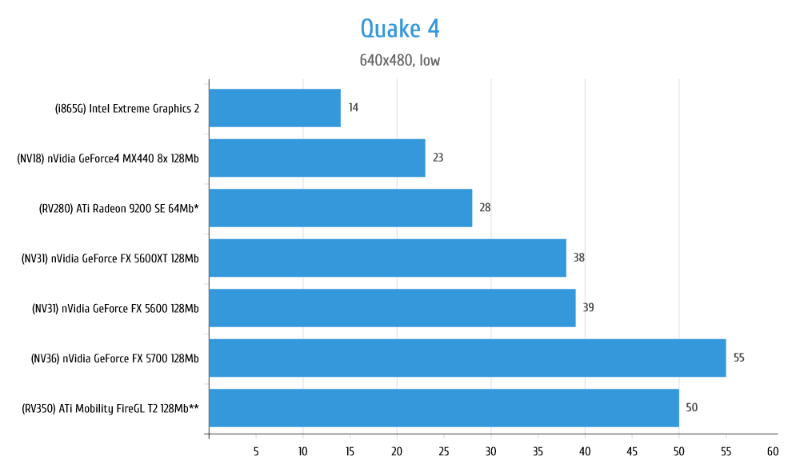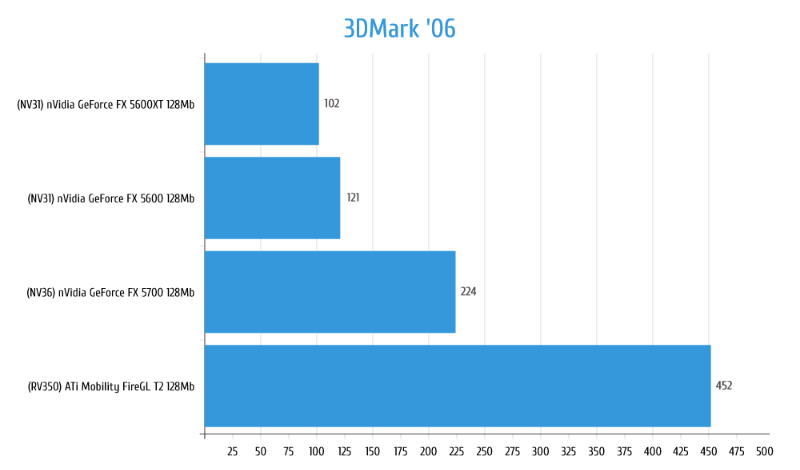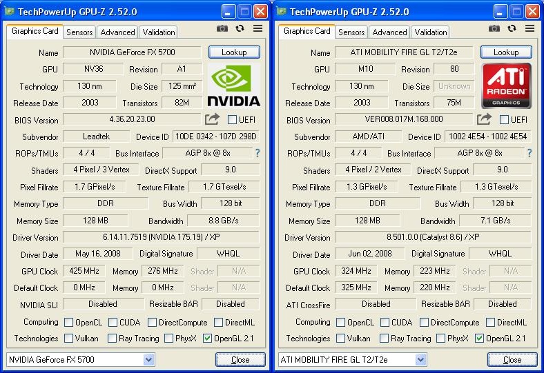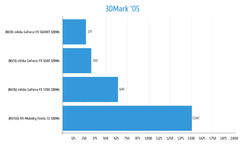Под именем Mobilty FireGL скрывается рядовой Radeon 9600, но чутка разогнана память с 200 до 220MHz. У GeForce FX 5700 так же разгон по памяти с 250 до 275MHz