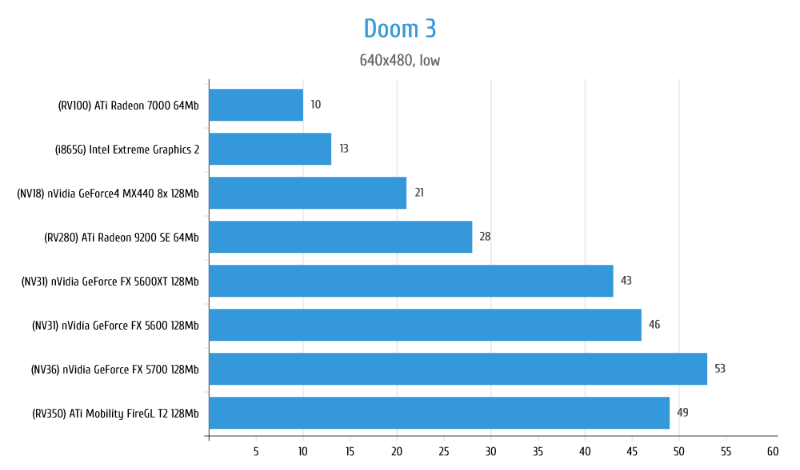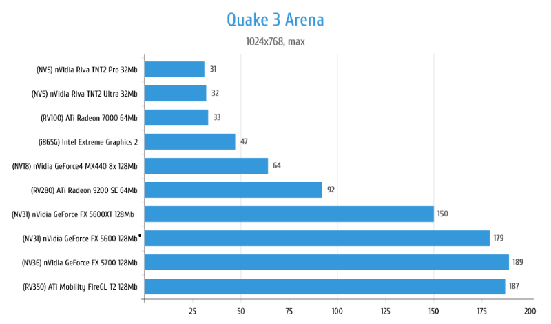 Из пары FX 5600 и FX 5600XT нас покидает FX 5600, так как мало того, что он показал никакущую производительности при учёте превосходства по частотам почти в 1,5 раза, так ещё с ним возникли проблемы с разрешением 1024х768, причём и меньше работают нормально и больше. Смена драйверов результата не дала, видимо проблема в самой карте. Учитывая что никаких артефактов и проблем со стабильностью у неё нет, я полагаю, что либо с завода у неё кривой BIOS, либо кто-то лазил в него кривыми руками.