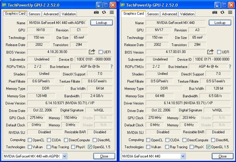 Как видим, у второй карточки ещё и частоты памяти повыше, но медленней AGP шина, которая, впрочем, я думаю, большой роли тут не сыграет.