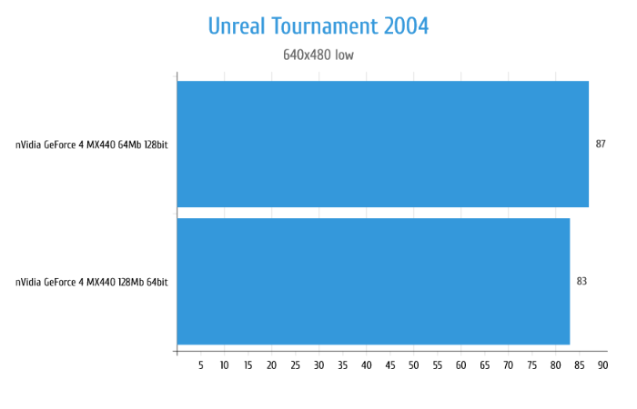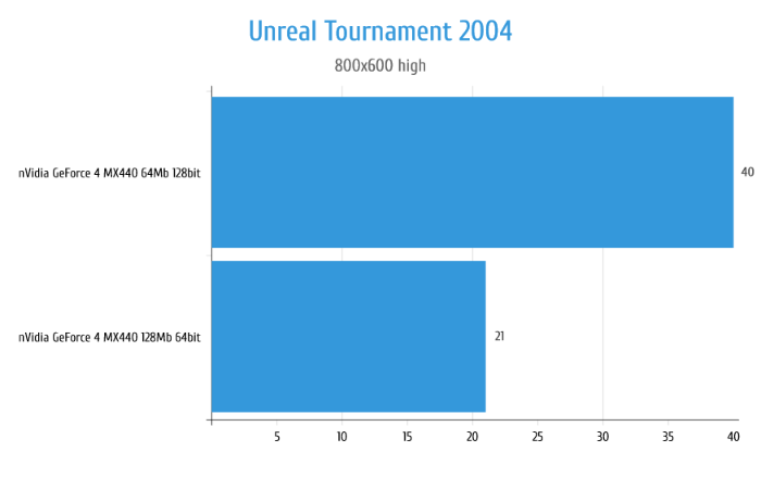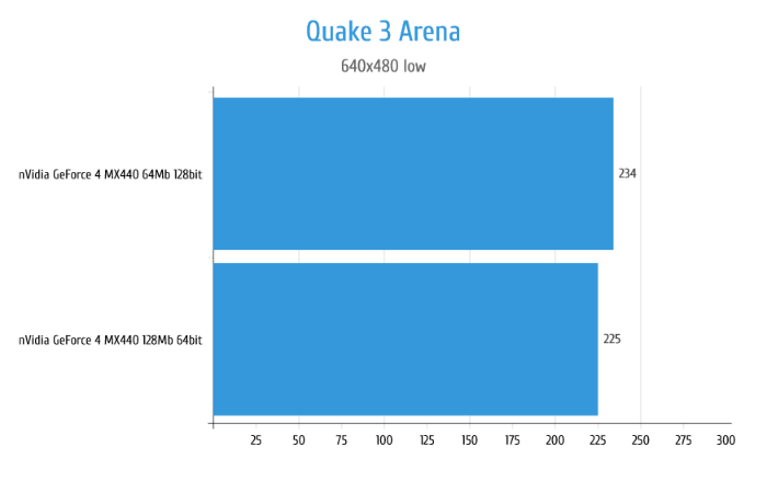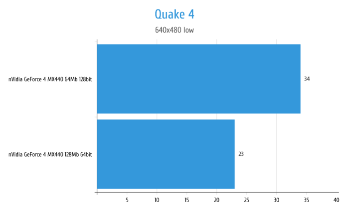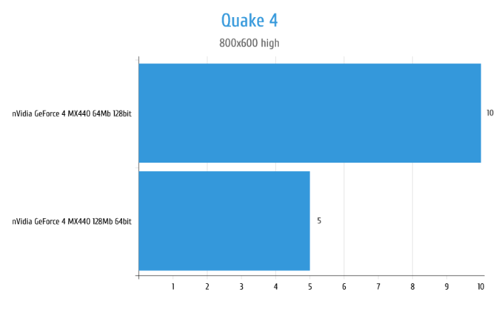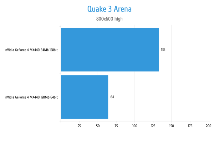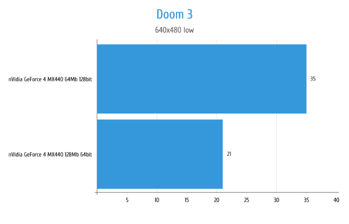 В Doom 3 ситуация ещё печальней, даже на минимальных настройках GeForce 4 MX440 с 64bit шиной памяти в полтора-два раза уступает аналогичной видеокарте только с 128bit шиной памяти, как видим, наличие 128Mb памяти на борту никак не влияет на производительность.