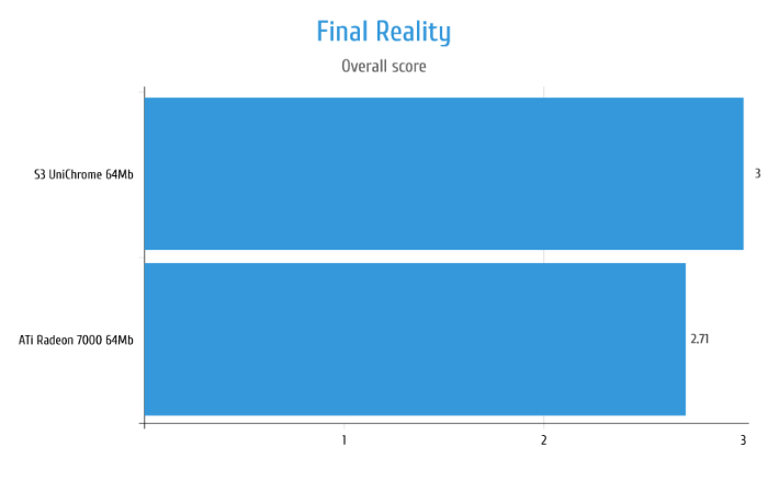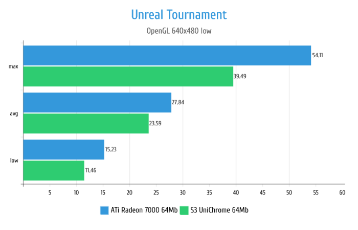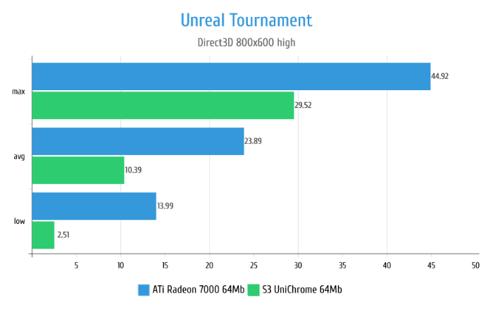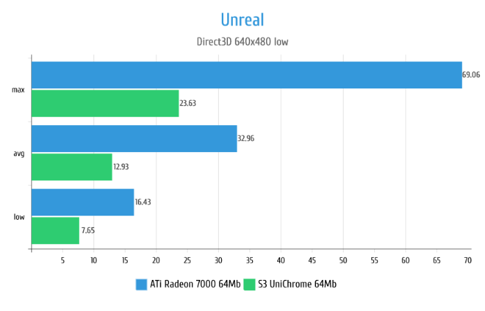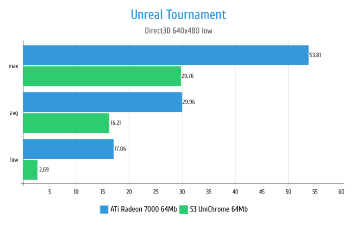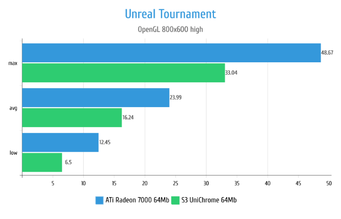 В Unreal видеокарта Radeon 7000 показывает себя прекрасно позволяя в принципе нормально играть на Direct3D рендере. S3 UniChrome хоть и показывает какие-то результаты, в реальности абсолютно не работоспособна в данной игре из-за жутких тормозов. На графиках этого не видно, но частенько изображение на S3 просто застывало на 1-2 секунды причём сложность сцены при этом никак не влияла.