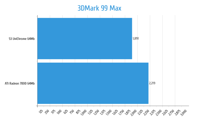 Стоит напомнить историю появления данных видеочипов на свет, S3 UniChrome является дальнейшим развитием S3 Savage3D который вышел в свет в далёком 1998 году и совершенствовался с переменным успехом фирмой S3 вплоть до банкротства компании в 2000 году. А Radeon 7000 напротив был не развитием, а скорее упрощением Radeon 7500 на архитектуре Rage 6 лишённой аппаратных блоков T&L, что отбрасывало его опять же на поколение назад в эпоху DirectX6.0. Так что можно сказать что данные видеочипы по сути одного поколения, так что вполне корректно их сравнивать в лоб без всяких оговорок.