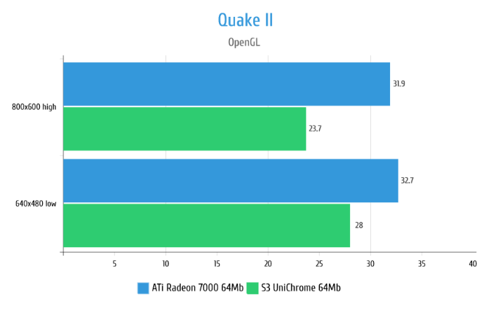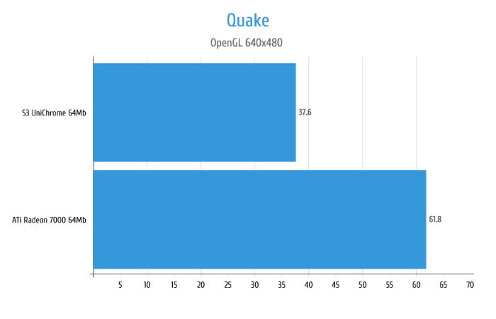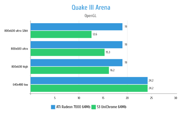 В играх на движке Quake в целом Radeon 7000 даёт ощутимую прибавку к производительности, однако в Quake III Arena видеокарта ведёт себя странно упираясь в 19 кадров и не реагируя на изменение настроек графики, на минимальных же настройках показывает такую же производительность что и S3 UniChrome.