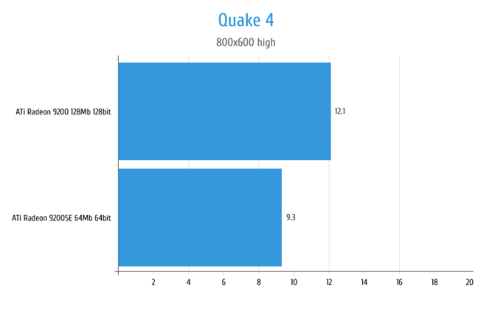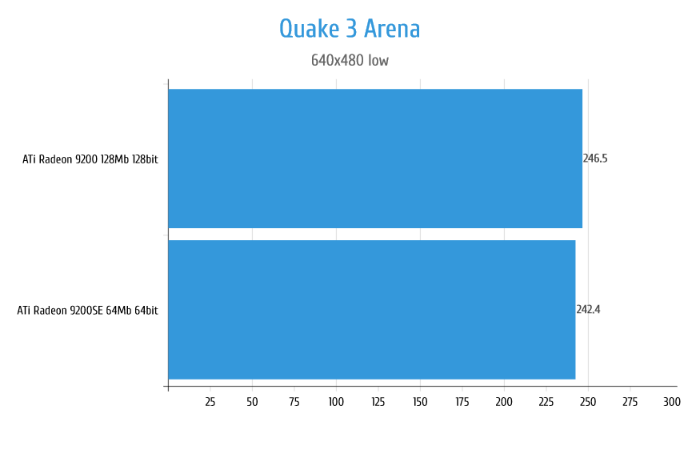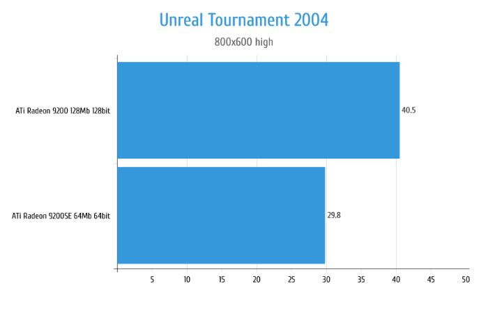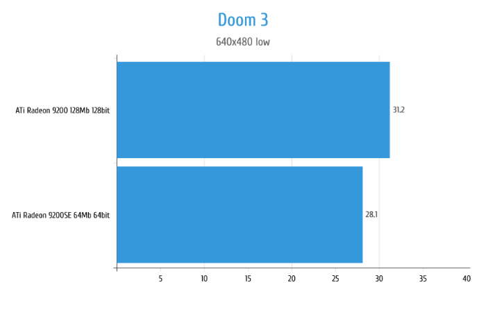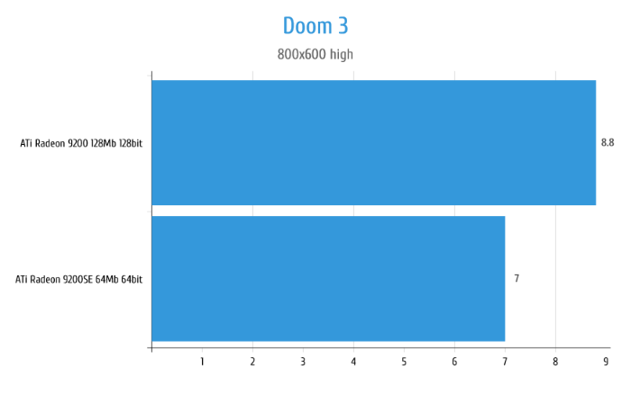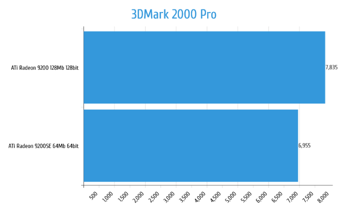 Ну что тут можно сказать, на фоне аналогичных тестов GeForce 4 MX440, с 1.5-2х кратной разницей в производительности видеокарт, результат просто отличный, разница в производительности между 64bit и 128bit у видеокарт Radeon 9200 не превышает 1.5 раз. Ну а наличие поддержки DirectX 8.1 так вообще ставит её на ступень выше чем GeForce 4 MX440. А вот сможет ли она потягаться другим представителем днища тех лет GeForce 5200 нам ещё предстоит узнать...