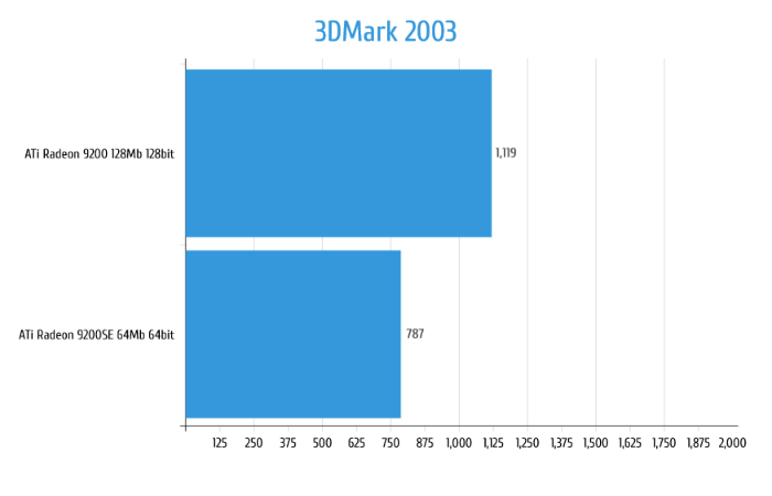 В 3DMark 2003 видеокарты прошли 3 теста из 4х доступных, в виду отсутствия поддержки DirectX 9.0