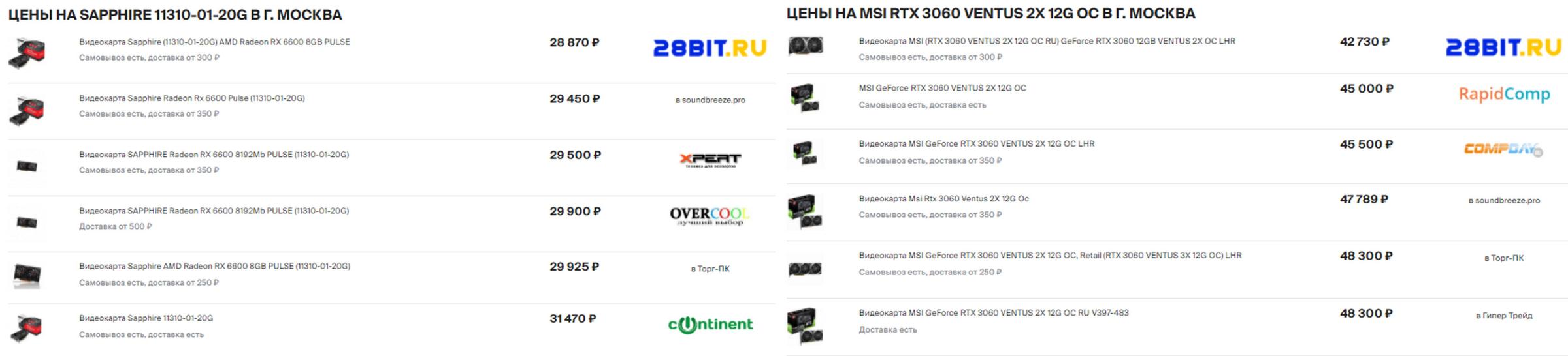 Конечно, можно пойти ниже по цене и выбрать GTX1070\1070Ti\1080, но живых экземпляров осталось не так много на барахолках и это лотерея. Не стоит списывать со счетов FSR 2.0 и карты от AMD, если Вы не питаете предрассудков к продукции красных. RX6600 - отличный вариант, но RTX3060 - естественно лучше.