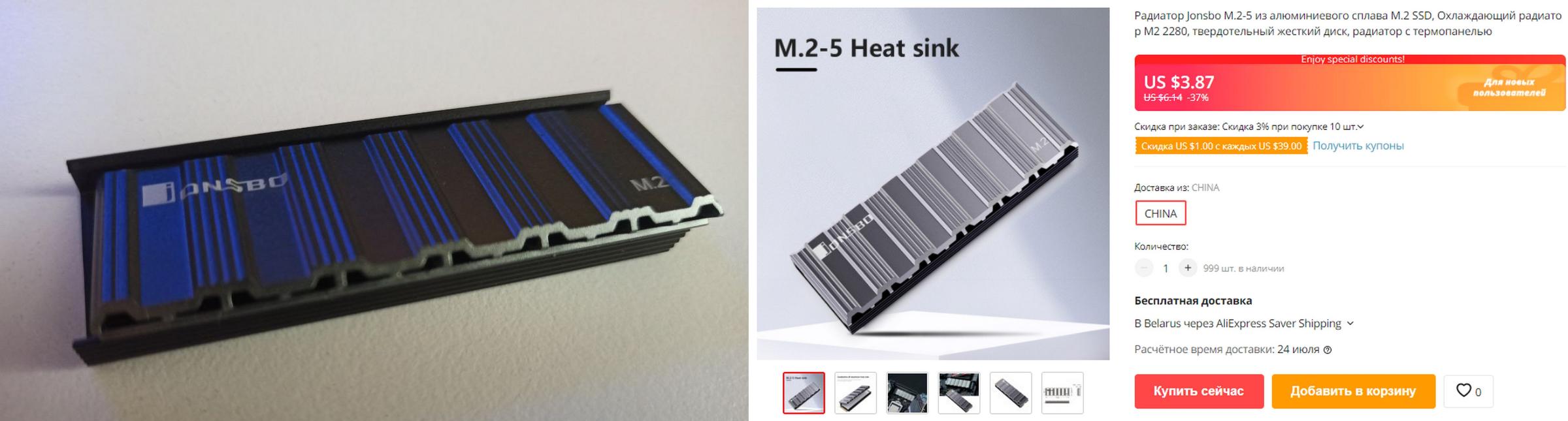 Конечно, это не огромный радиатор на материнке Asrock B660m Pro RS с термопрокладками Laird, но результат достойный. Спокойно охладит тот же горячий Samsung 970Pro.