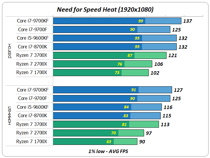 По диаграмме производительности процессоров в восьми играх видно, что в номинальном режиме работы Ryzen 7 3700X занял второе место, разделив его с моделями Core i5-9600KF и Core i7-8700K. Из-за слабого частотного потенциала новичок ничем не смог «блеснуть» после разгона. В результате он … остался все на том же втором месте, на этот раз, разделив его с процессорами Core i5-9600KF и Core i7-9700F.