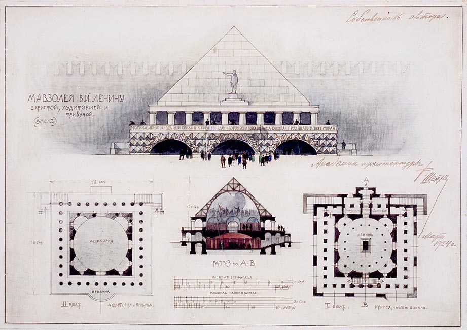 Один из нереализованных проектов Мавзолея Ленина, участвовавших в конкурсе (1924 год). Автор — Фёдор Шехтель (Слева). Исаак Бродский «У Мавзолея Ленина». Бумага, акварель, графитный карандаш, гуашь, 1924 год (Справа).