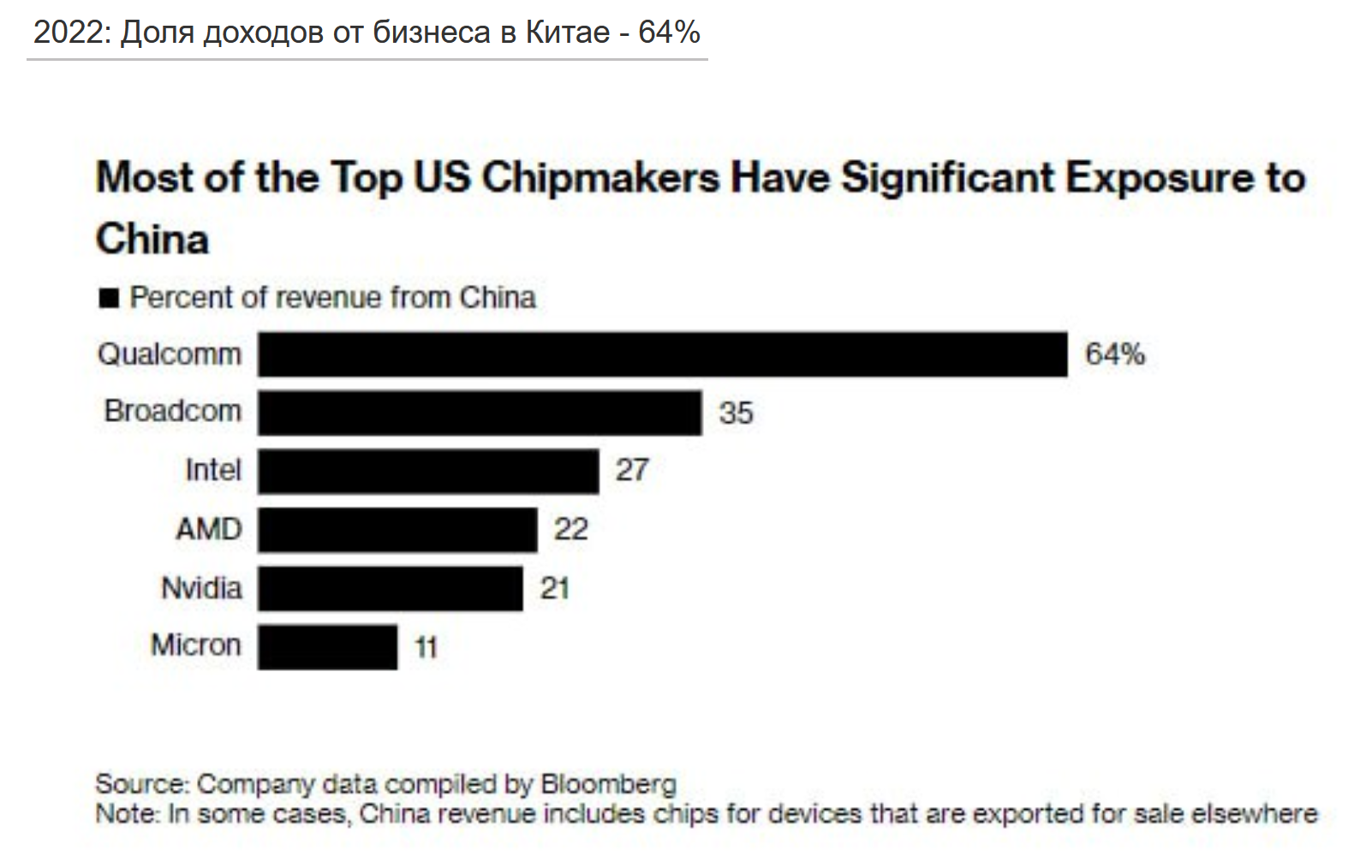 Доля доходов американских поставщиков чипов от бизнеса в Китае