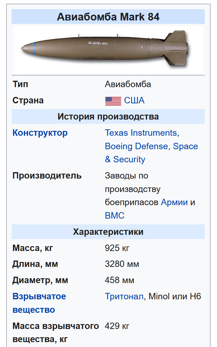 Mark 84 может образовывать гигантскую воронку 15 метров диаметром и 11 метров глубиной. А радиус поражения осколками превышает 370 метров.