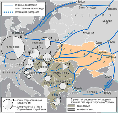 Схемы газопроводов из России, а также доля российского газа в общем объёме потребления.