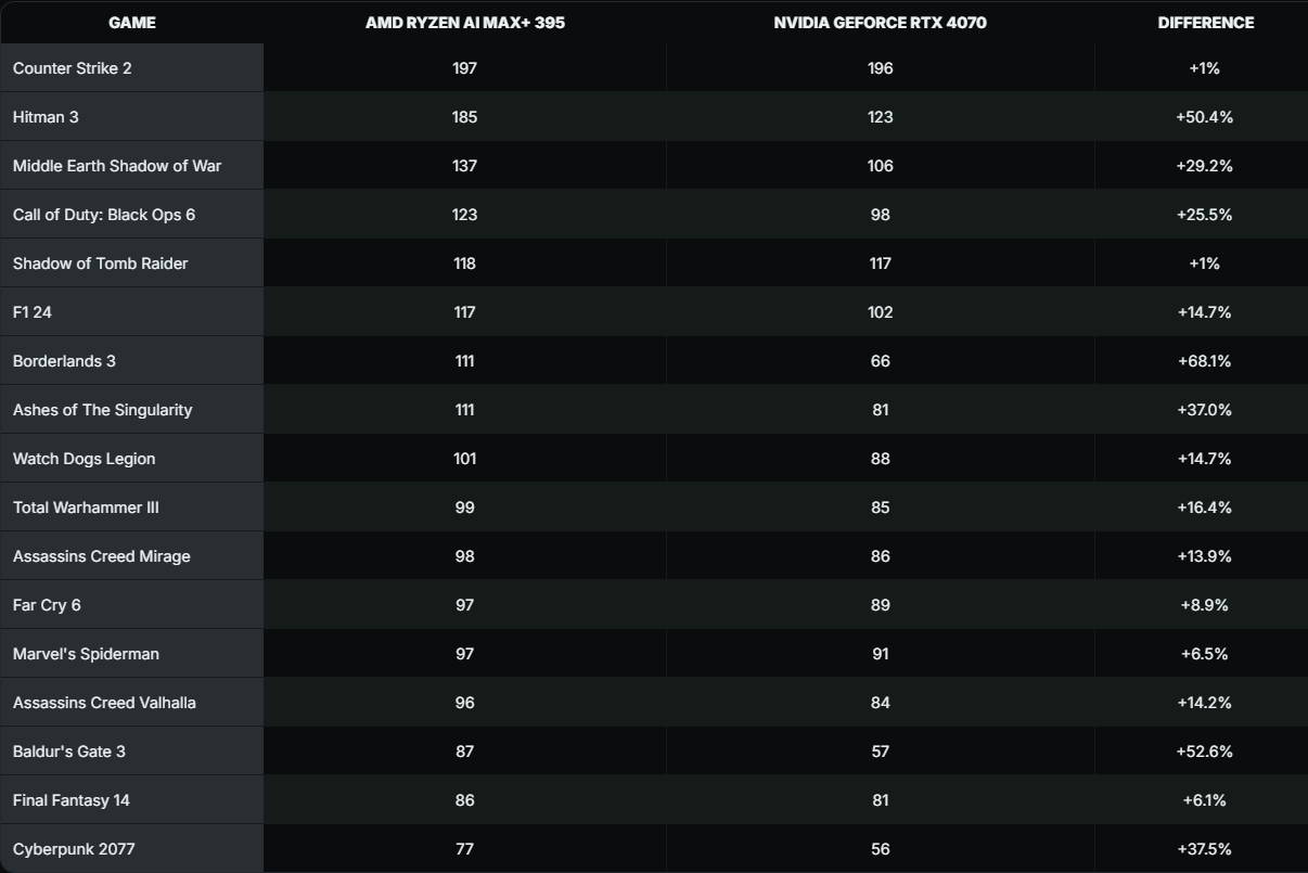 Согласно тестам, новая «встройка» Radeon 8060S оказалась на 23,2 % быстрее RTX 4070М. А в некоторых играх более чем на 50 %. Наибольший разрыв был зафиксирован в Borderlands 3 (68 %), а также в Hitman 3 (50,4 %) и Baldur's Gate 3 (52,6 %).