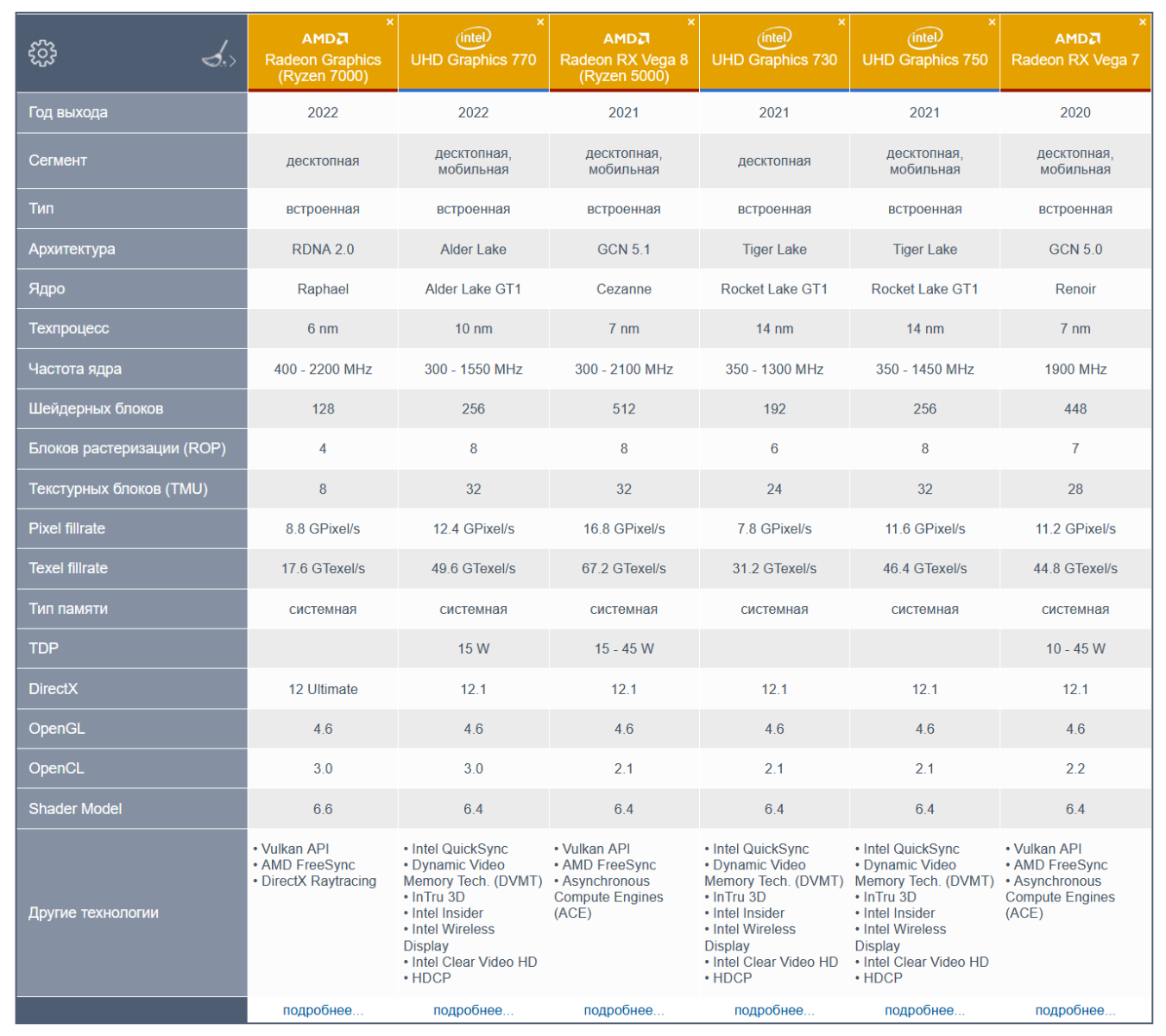 Рассмотрим сравнение встроенной графики актуальных на сегодня процессоров. Сразу оговоримся, что в первой колонке таблицы будут приводиться примеры моделей процессоров, а не все их наименования.