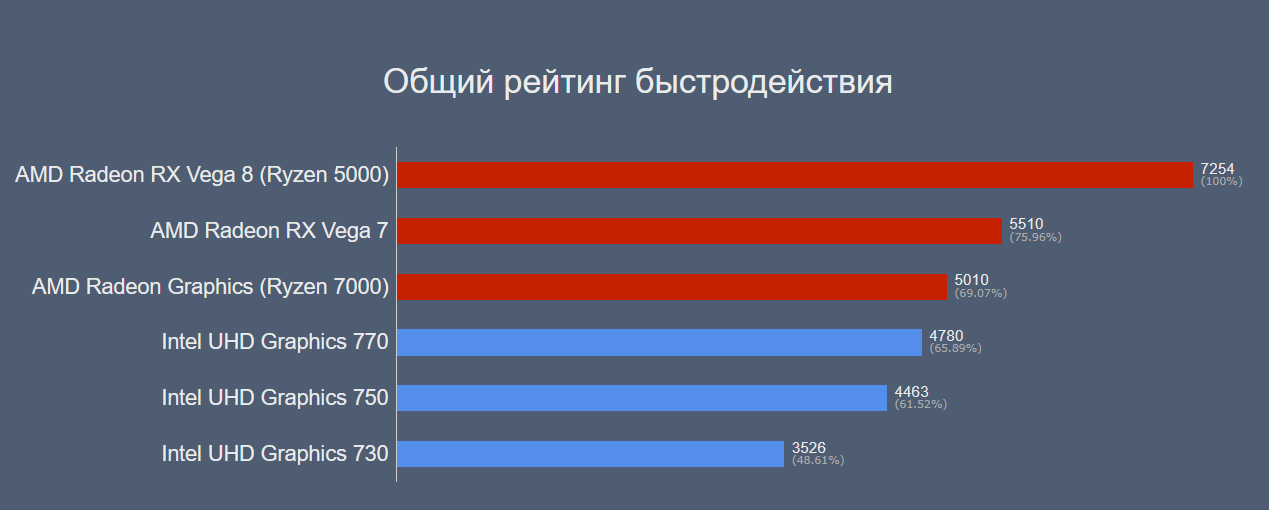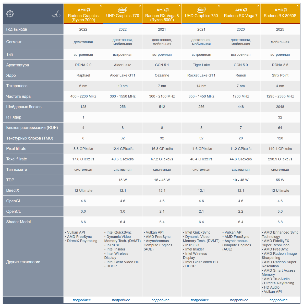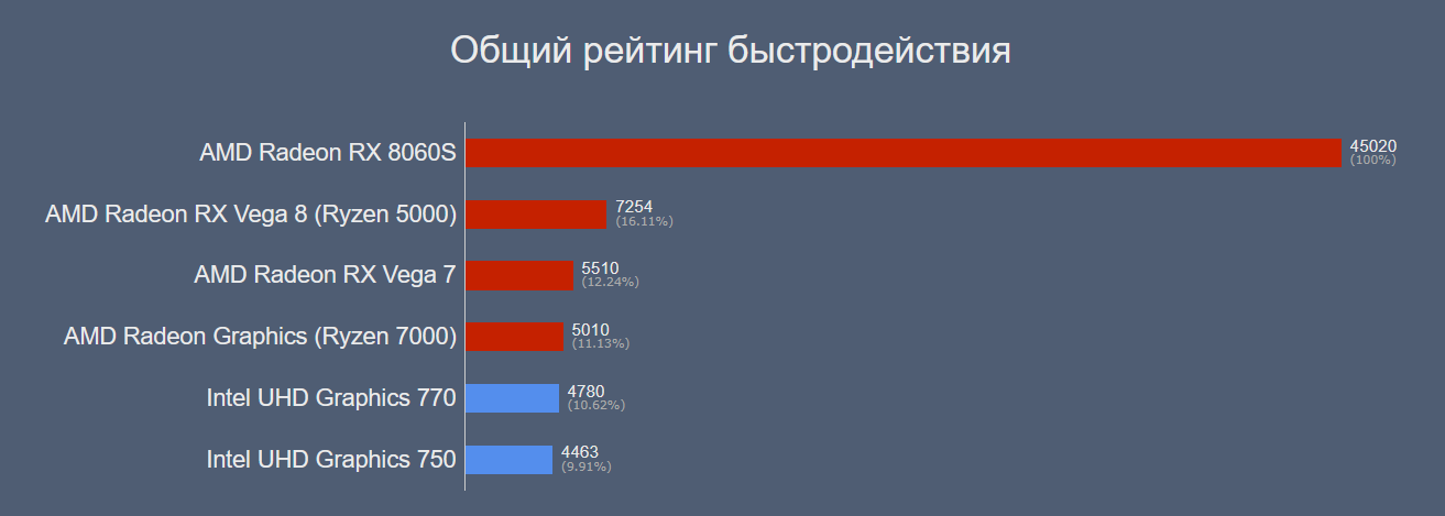 А теперь уберём из сравнения наиболее слабую Intel UHD Graphics 730 и добавим нашу новинку Radeon 8060S. И получим разницу в 6 раз по сравнению с Radeon RX Vega 8 (Ryzen 5000).