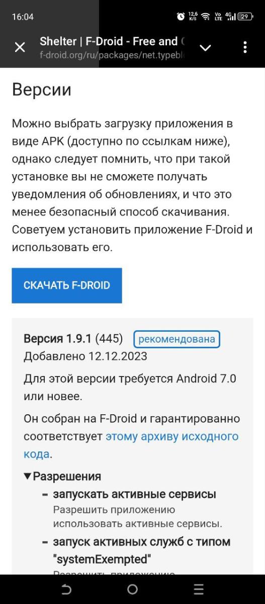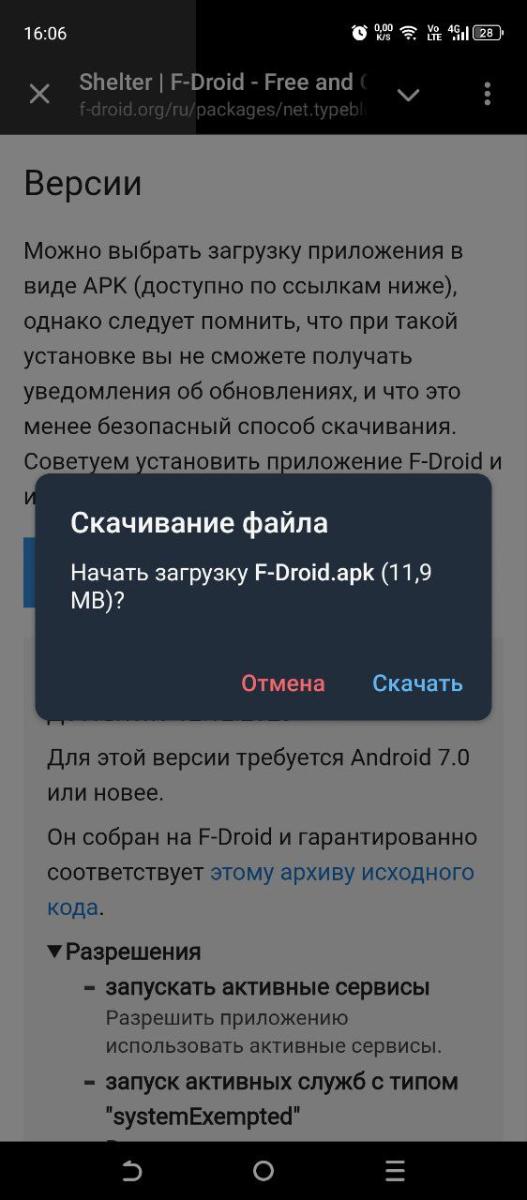 Скачиваем песочницу Shelter, нажав «Скачать APK». Скачается файл net.typeblog.shelter_445.apk, установим его, нажав «Установить».
