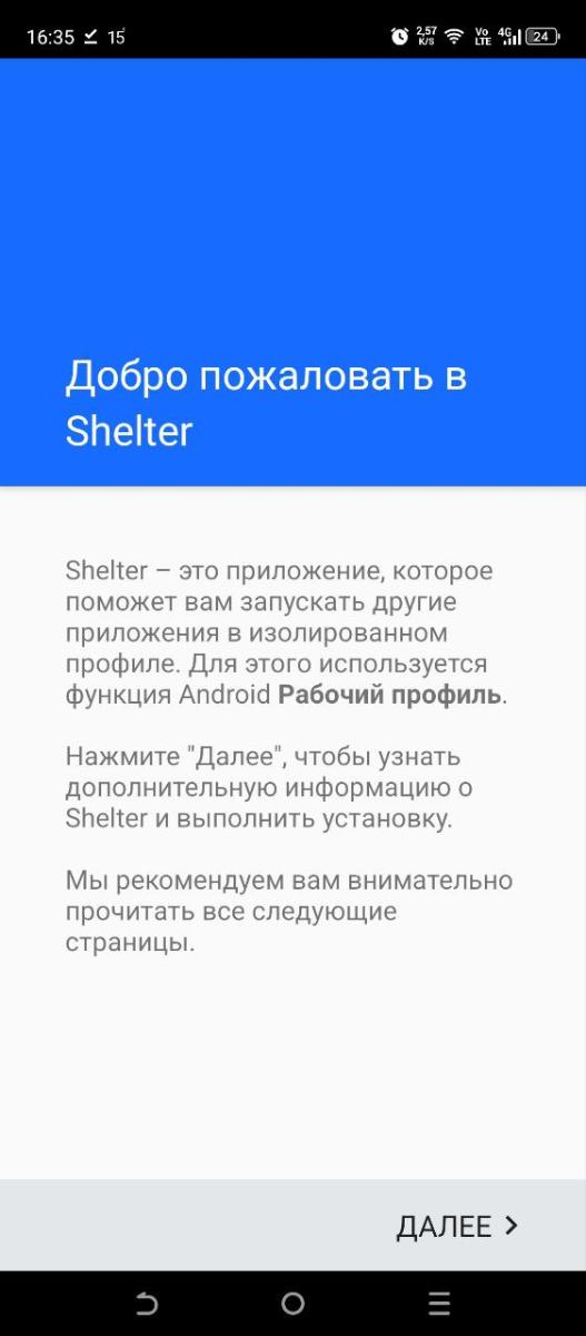 Попадаем в раздел «Добро пожаловать в Shelter» и в правом нижнем углу нажимаем «ДАЛЕЕ». Нас перекинет на страницу «Пару слов о разрешениях». Тут предупреждается, что приложение Shelter будет обладать обширными правами внутри своего профиля, в котором и будет запускаться наш мессенджер. Нажимаем «ДАЛЕЕ».