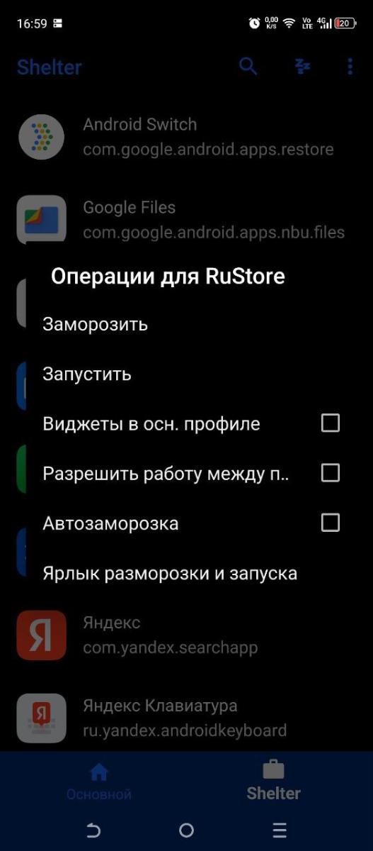 В основных находим RuStore, нажимаем на него и появится всплывающее окно «Операции для RuStore» с предложением «Клонировать в Shelter». На секунду появится всплывающее уведомление, что приложение успешно клонировано.