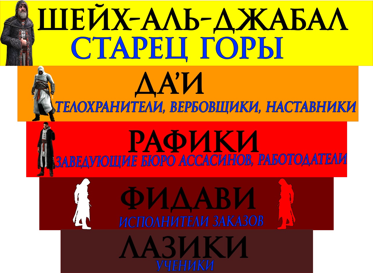 Выше них по иерархии шли «даи». Они обычно передавали волю Старца Горы фидаинам и рафИкам (аналог средних офицеров).